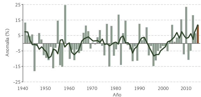 Figura 1. Anomalía de la precipitación anual en México (1941–2015). Fuente: CONAGUA (2015). Reporte del Clima en México. Reporte Anual 2015. SEMARNAT. Disponible en: https://apps1.semarnat.gob.mx:8443/dgeia/informe15/tema/cap5.html